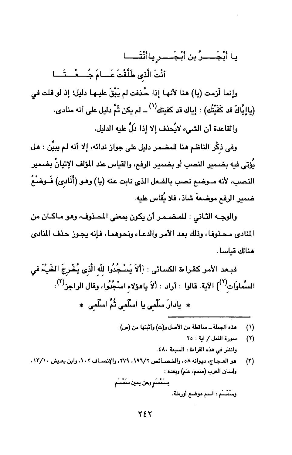 وفي ذكر الناظم هنا للمضمر دليل على جواز ندائه، إلا أنه لم يبين: هل يؤتى فيه بضمير النصب أو بضمير الرفع، والقياس عند المؤلف الإتيان بضمير النصب، لأنه موضع نصب بالفعل الذي نابت عنه (يا) وهو (أنادى) فوضع ضمير الرفع موضعه شاذ، فلا يقاس عليه.
