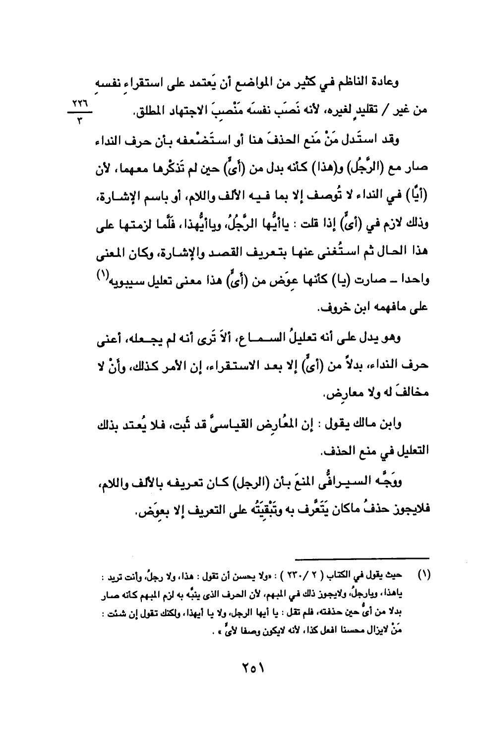 وقد استدل من منع الحذف هنا أو استضعفه بأن حرف النداء صار مع (الرجل) و (هذا) كأنه بدل من (أي) حين لم تذكرها معهما، لأن (أيًا) في النداء لا توصف إلا بما فيه الألف واللام، أو باسم الإشارة، وذلك لازم في (أي) إذا قلت: يا أيها الرجل، ويا أيهذا، فلما لزمتها على هذا الحال ثم استغنى عنها بتعريف القصد والإشارة، وكان المعنى واحدا - صارت (يا) كأنها عوض من (أي) هذا معنى تعليل سيبويه على ما فهمه ابن خروف.