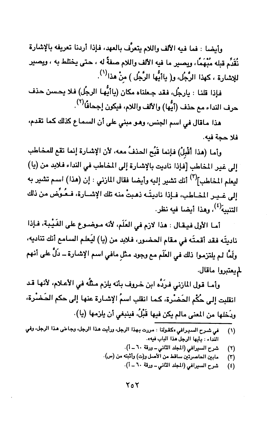 وأما قول المازني فرده ابن خروف بأنه يلزم مثله في الأعلام، لأنها قد انقلبت إلى حكم الحضرة، كما انقلب اسم الإشارة عنها إلى حكم الحضرة، ودخلها من المعنى ما لم يكن فيها قبل، فينبغي أن يلزمها (يا).