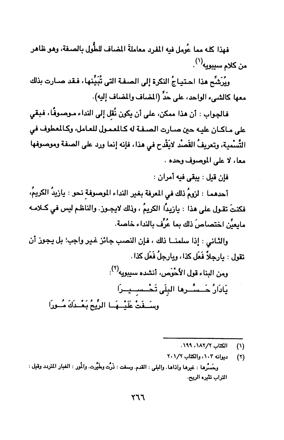 أحدهما: لزوم ذلك في المعرفة بغير النداء الموصوفة نحو: يا زيد الكريم، فكنت تقول على هذا: يا زيدًا الكريم، وذلك لا يجوز. والناظم ليس في كلامه ما يعين اختصاص ذلك بما عرف بالنداء خاصة.