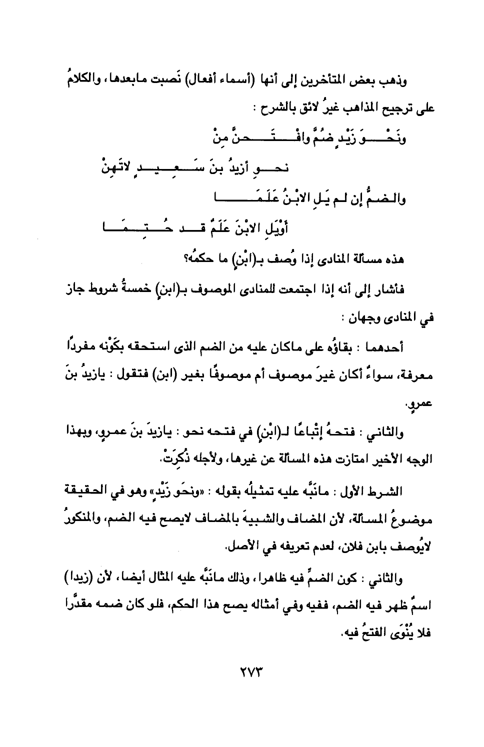 الشرط الأول: ما نبه عليه تمثيله بقوله: "ونحو زيدٍ" وهو في الحقيقة موضوع المسألة، لأن المضاف والشبيه بالمضاف لا يصح فيه الضم، والمنكور لا يوصف بابن فلان، لعدم تعريفه في الأصل.