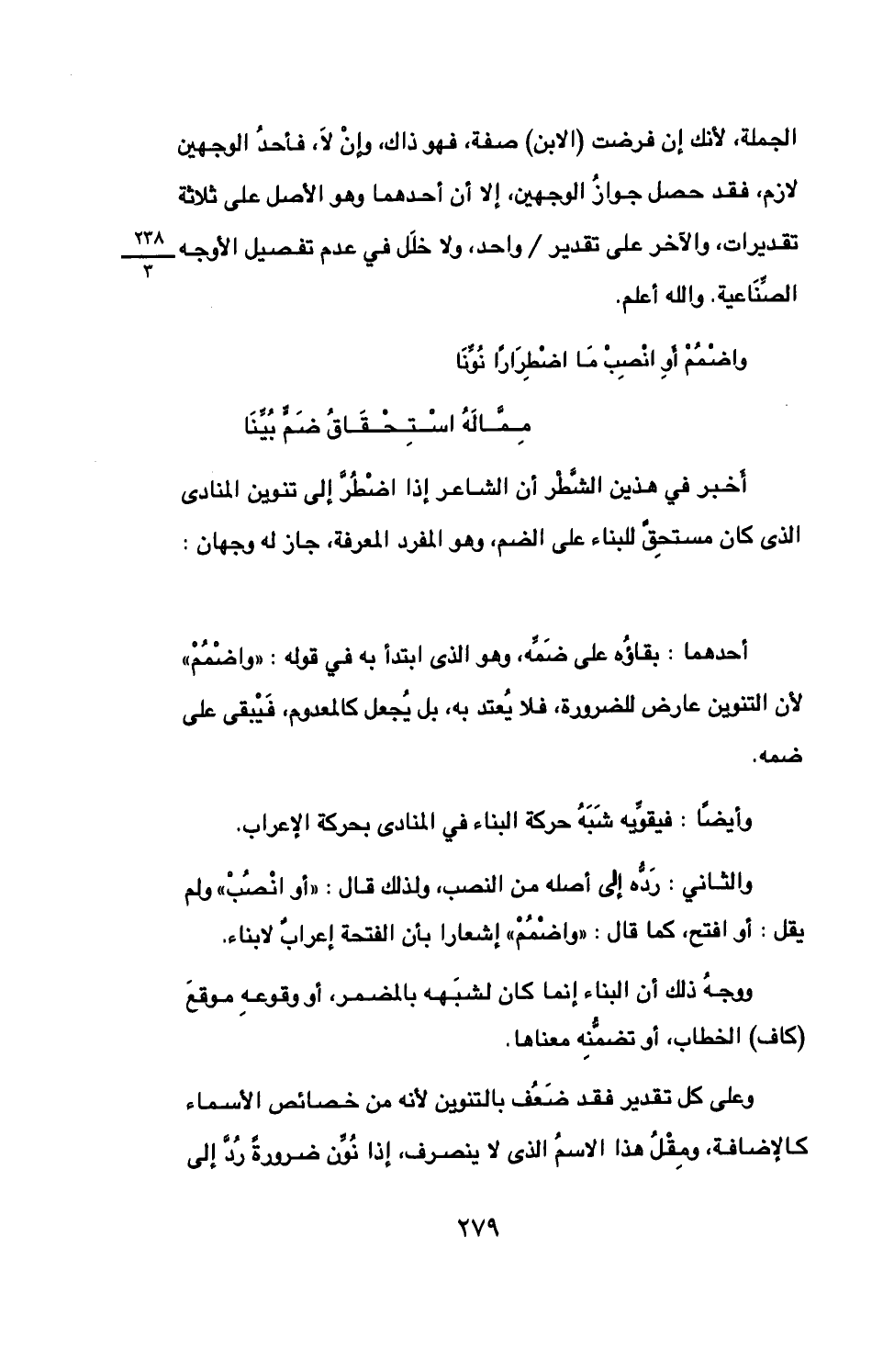أخبر في هذين الشطر أن الشاعر إذا اضطر إلى تنوين المنادى الذي كان مستحًق للبناء على الضم، وهو المفرد المعرفة، جاز له وجهان: