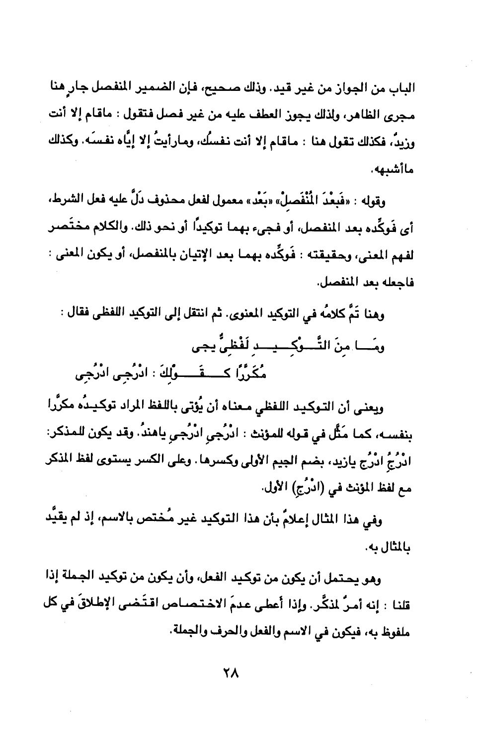 ويعنى أن التوكيد اللفظي معناه أن يوتى باللفظ المراد توكيده مكررا بنفسه، كما مثل في قوله للمؤنت: ادرجى ادرجى يا هند. وقد يكون للمذكر: ادرج ادرج يا زيد، بضم الجيم الأولى وكسرها. وعلى الكسر يستوى لفط المذكر مع لفظ المؤنث في (ادرج) الأول.