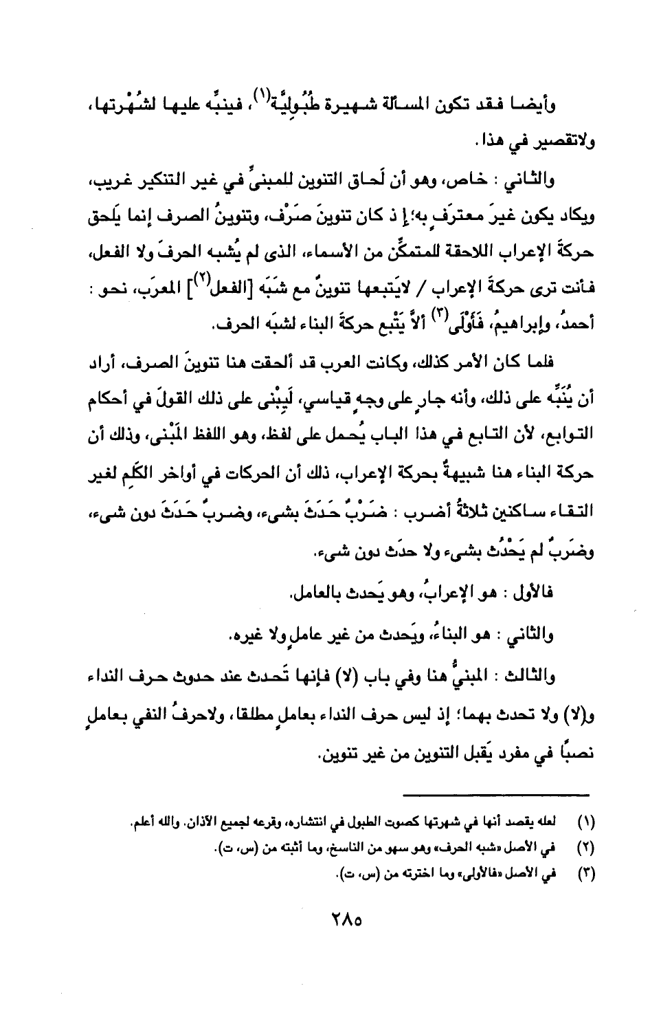 والثالث: المبنى هنا وفي باب (لا) فإنها تحدث عند حدوث حرف النداء و (لا) ولا تحدث بهما؛ إذ ليس حرف النداء بعاملٍ مطلقا، ولا حرف النفي بعاملٍ نصبًا في مفرد يقبل التنوين من غير تنوين.