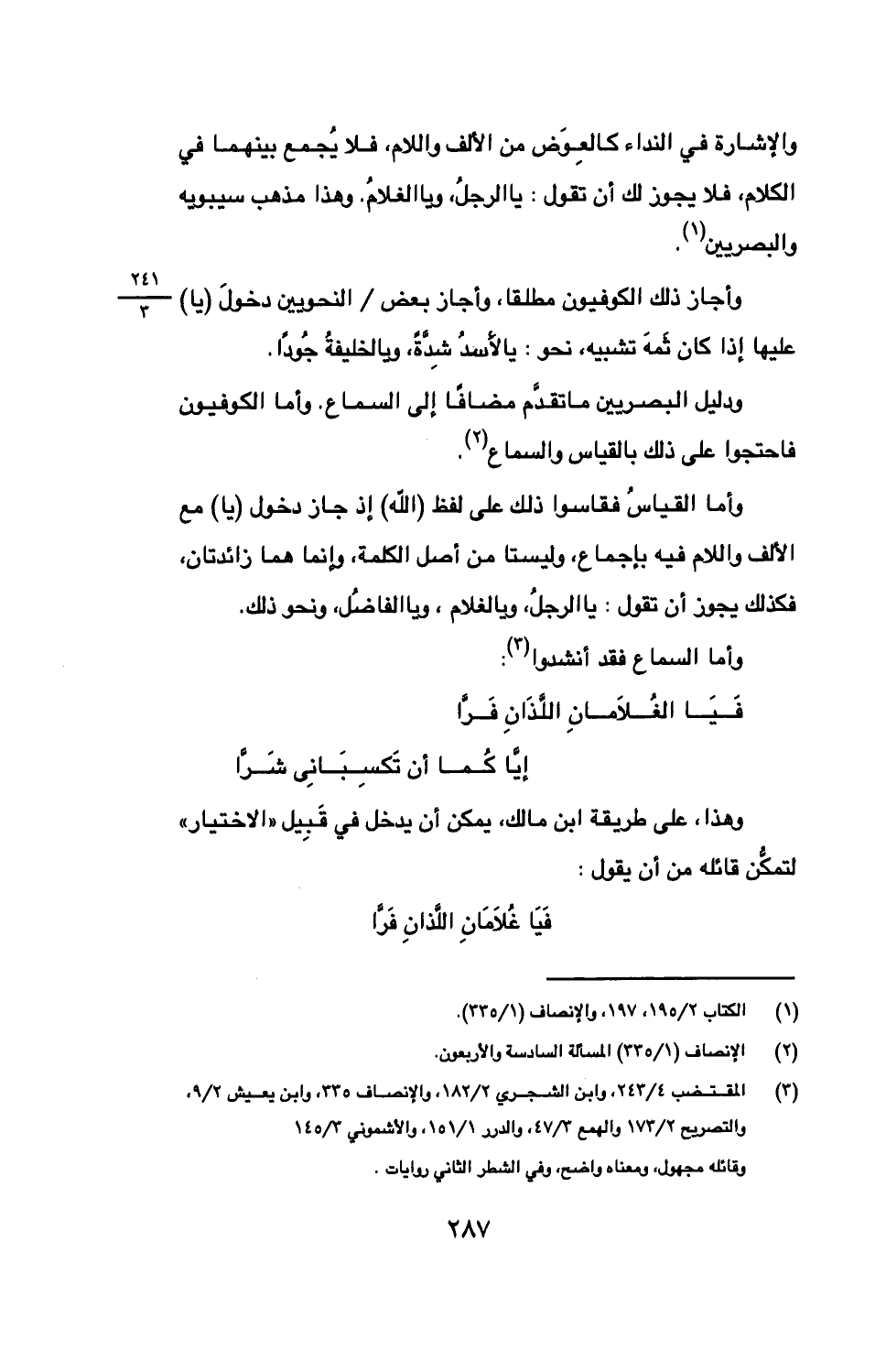 وأما القياس فقاسوا ذلك على لفظ (الله) إذ جاز دخول (يا) مع الألف واللام فيه بإجماع، وليستا من أصل الكلمة، وإنما هما زائدتان، فكذلك يجوز أن تقول: يا الرجل، ويا لغلام، ويا الفاضل، ونحو ذلك.