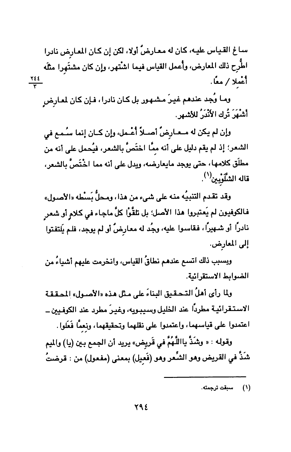 وقد تقدم التنبيه منه على شيء من هذا، ومحل بسطه "الأصول" فالكوفيون لم يعتبروا هذا الأصل؛ بل تلقوا كل ما جاء في كلامٍ أو شعرٍ نادرًا أو شهيرًا، فقاسوا عليه، وجد له معارض أو لم يوجد، فلم يلتفتوا إلى المعارض.