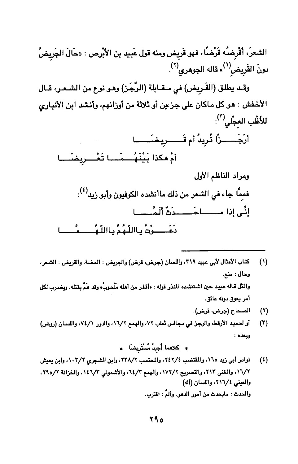 وقد يطلق (القريض) في مقابلة (الرجز) وهو نوع من الشعر، قال الأخفش: هو كل ما كان على جزءين أو ثلاثة من أوزانهم، وأنشد ابن الأنباري للأغلب العجلي: