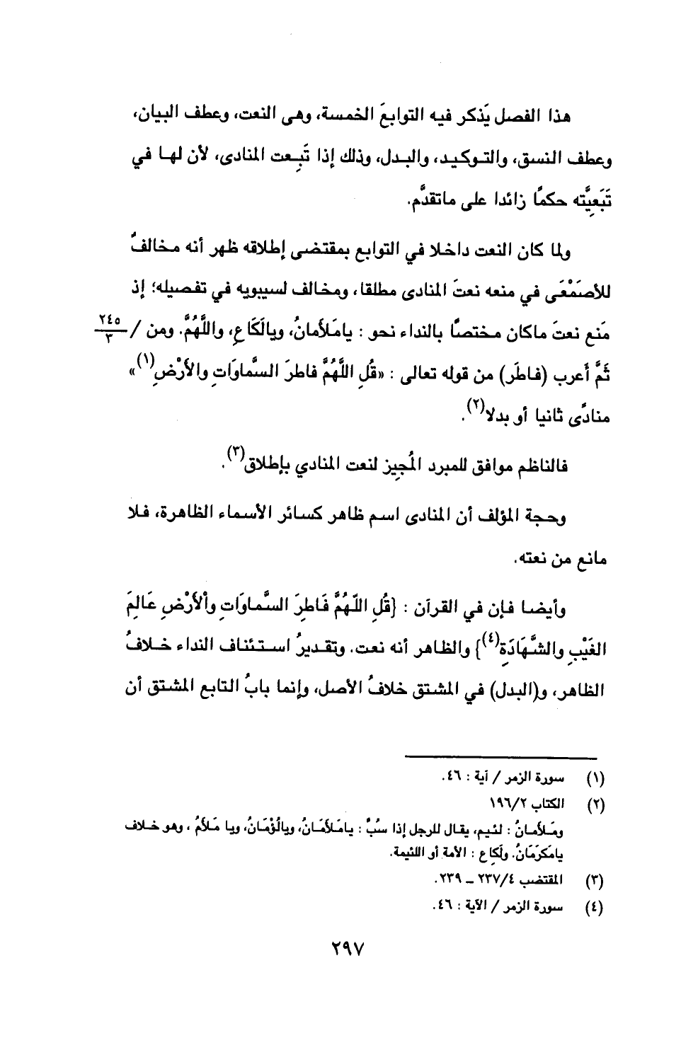 وأيضا فإن في القرآن: } قل اللهم فاطر السماوات والأرض عالم الغيب والشهادة {والظاهر أنه نعت. وتقدير استئناف النداء خلاف الظاهر، و (البدل) في المشتق خلاف الأصل، وإنما باب التابع المشتق أن