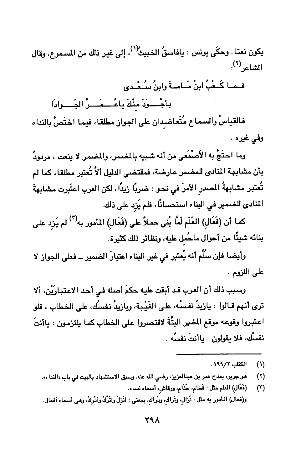 وما احتج به الأصمعي من أنه شبيه بالمضمر، والمضمر لا ينعت، مردود بأن مشابهة المنادى للمضمر عارضة، فمقتضى الدليل ألا تعتبر مطلقا، كما لم تعتبر مشابهة المصدر الأمر في نحو: ضربًا زيدًا، لكن العرب اعتبرت مشابهة المنادى للضمير في البناء استحسانًا، فلم يزد على ذلك.