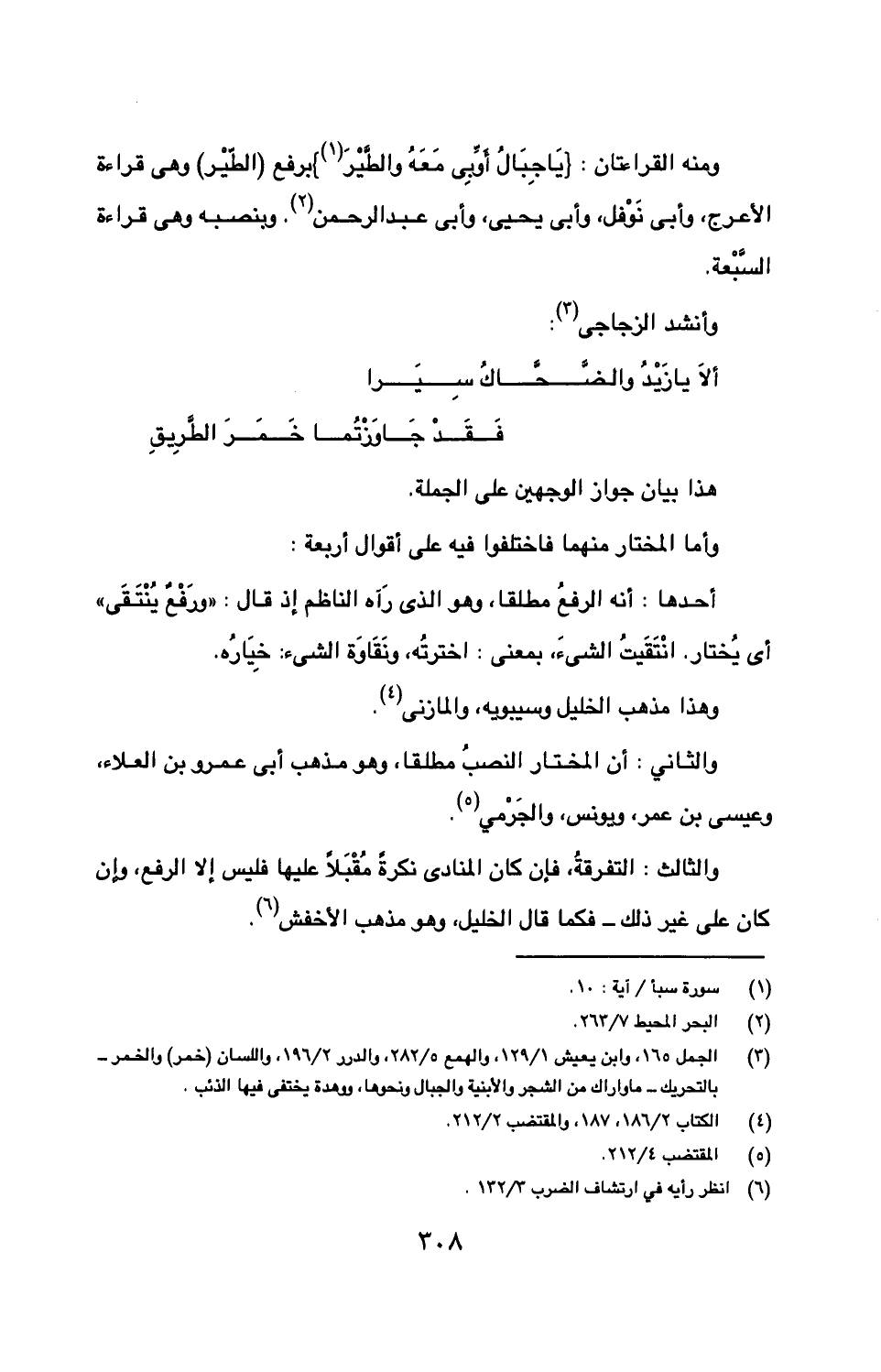 ومنه القراءتان: } يا جبال أوبي معه والطير {برفع (الطير) وهي قراءة الأعرج، وأبى نوفل، وأبى يحيي، وأبى عبد الرحمن. وبنصبه وهي قراءة السبعة.