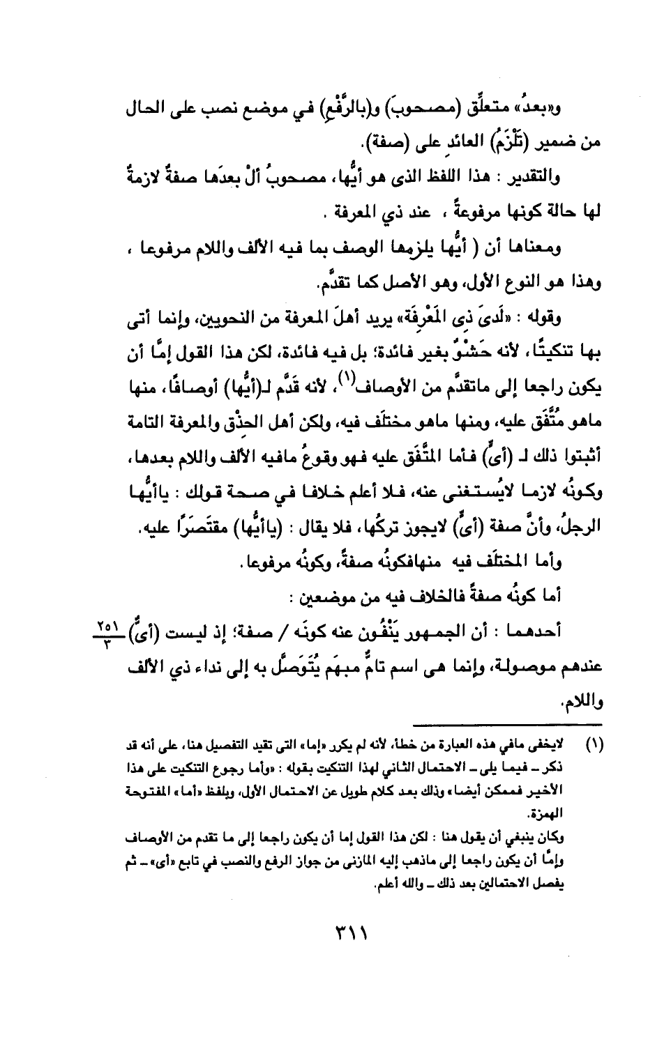 ومعناها أن (أيها يلزمها الوصف بما فيه الألف واللام مرفوعا، وهذا هو النوع الأول، وهو الأصل كما تقدم.