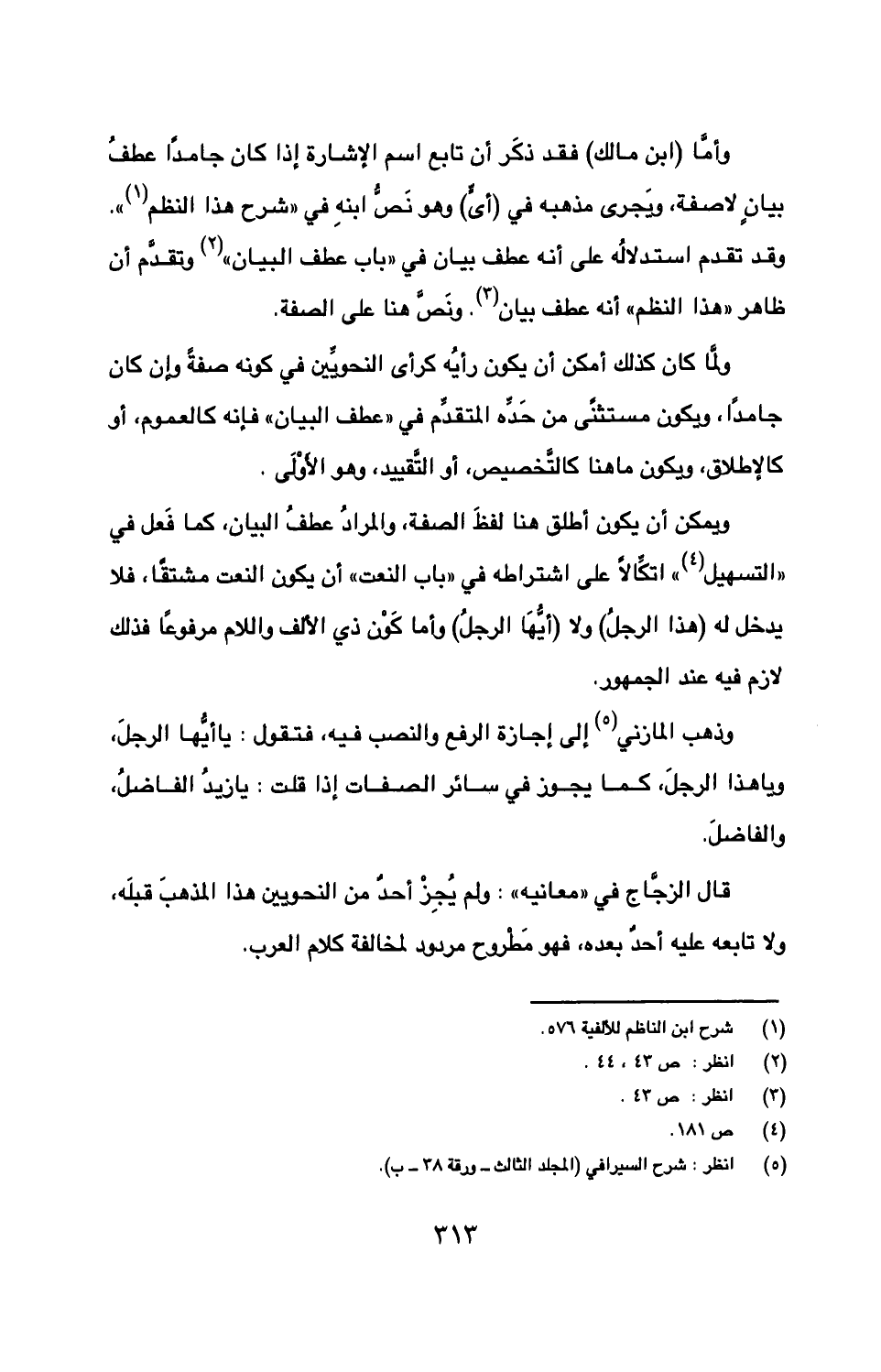 ويمكن أن يكون أطلق هنا لفظ الصفة، والمراد عطف البيان، كما فعل في "التسهيل" اتكالاً على اشتراطه في "باب النعت" أن يكون النعت مشتقًا، فلا يدخل له (هذا الرجل) ولا (أيها الرجل) وأما كون ذي الألف واللام مرفوعًا فذلك لازم فيه عند الجمهور.