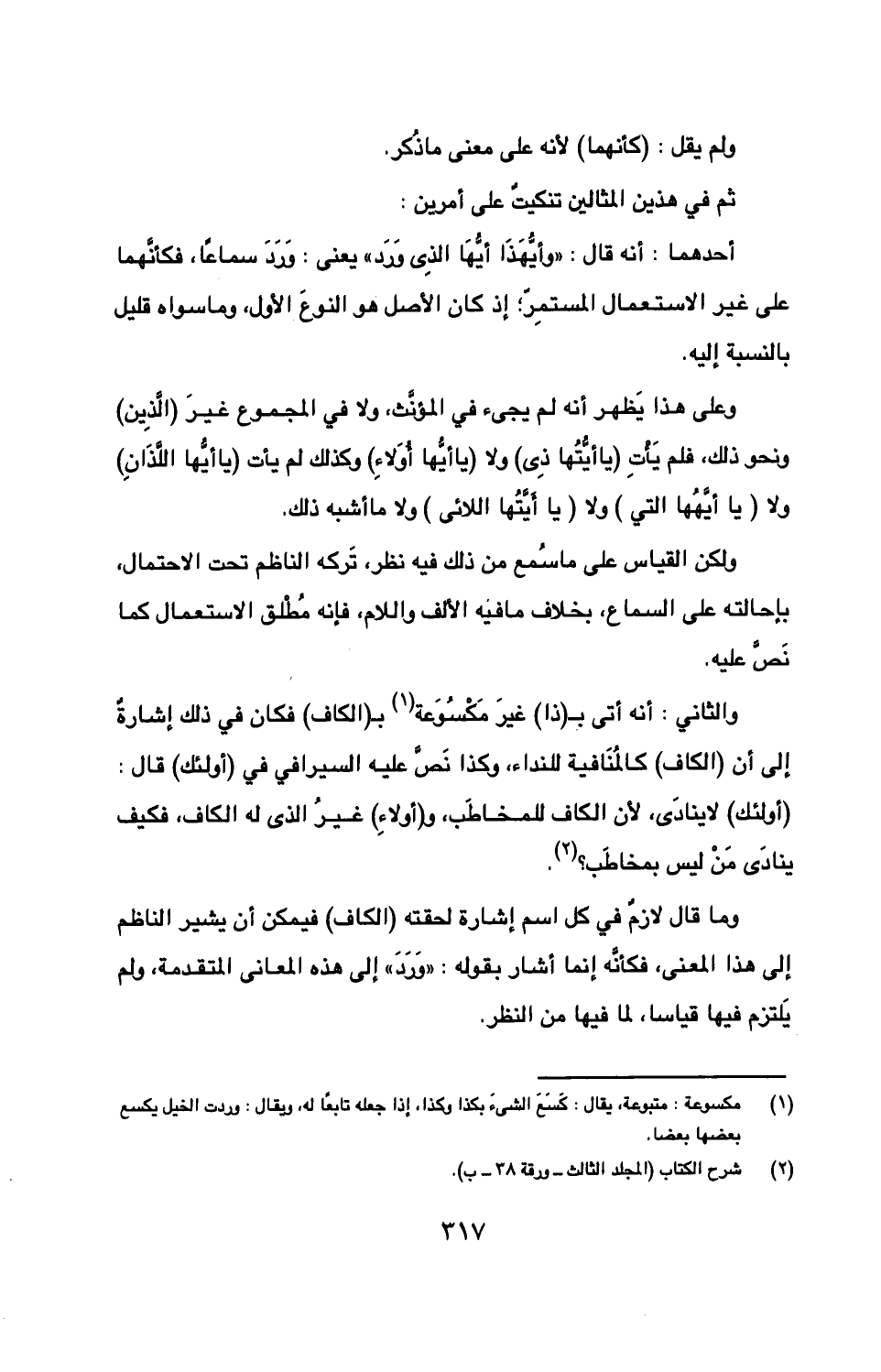 والثاني: أنه أتى بـ (ذا) غير مكسوعة بـ (الكاف) فكان في ذلك إشارة إلى أن (الكاف) كالمنافية للنداءن وكذا نص عليه السيرافي في (أولئك) قال: (أولئك) لا ينادي، لأن الكاف للمخاطب، و (أولاء) غير الذي له الكاف، فكيف ينادى من ليس بمخاطب؟