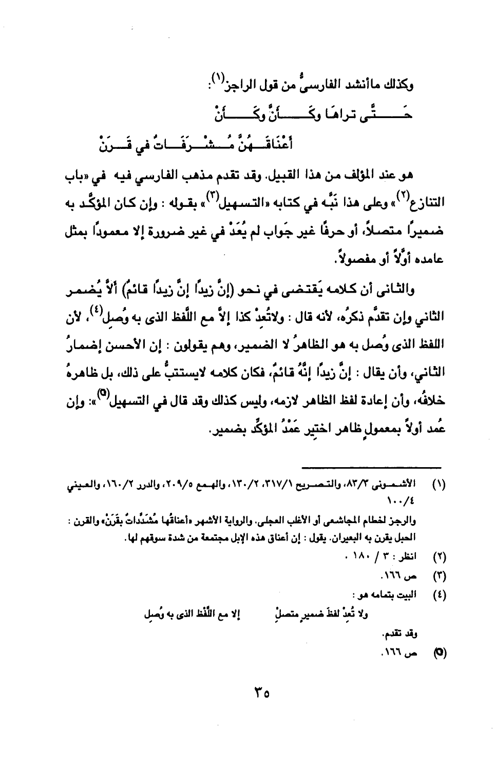 هو عند المؤلف من هذا القبيل. وقد تقدم مذهب الفارسي فيه في "باب التنازع (¬2) " وعلى هذا نبه في كتابه "التسهيل (¬3) " بقوله: وإن كان المؤكد به ضميرا متصلا، أو حرفا غير جواب لم يعد في غير ضرورة إلا معمودا بمثل عامده أولا أو مفصولا.