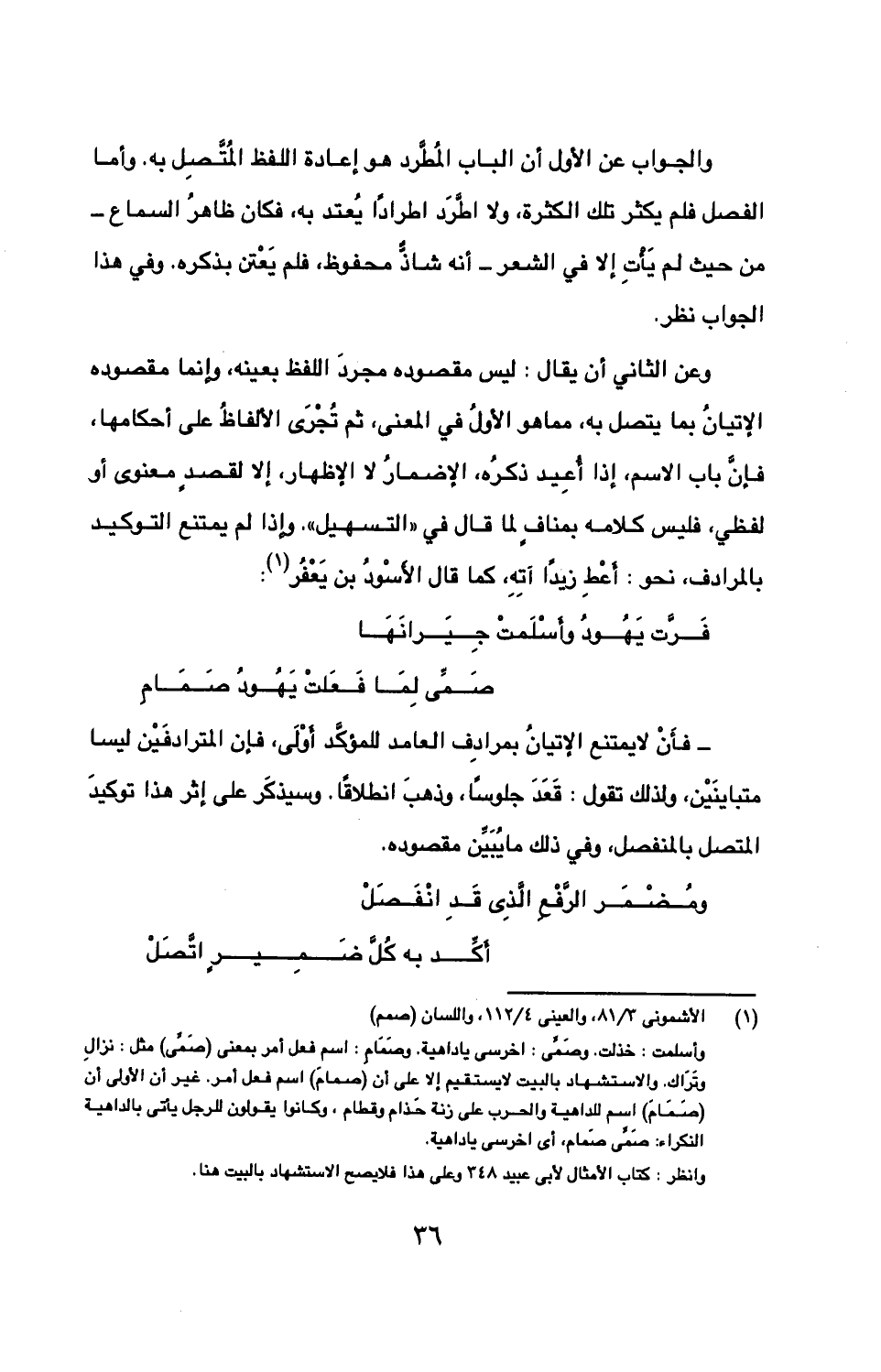 والجواب عن الأول أن الباب المطرد هو إعادة اللفظ المتصل به، وأما الفصل فلم يكثر تلك الكثرة، ولا اطرد اطرادا يعتد به، فكان ظاهر السماع _ من حيث لم يأت إلا في الشعر _ أنه شاذ محفوظ، فلم يعتن بذكره. وفي هذا الجواب نظر.