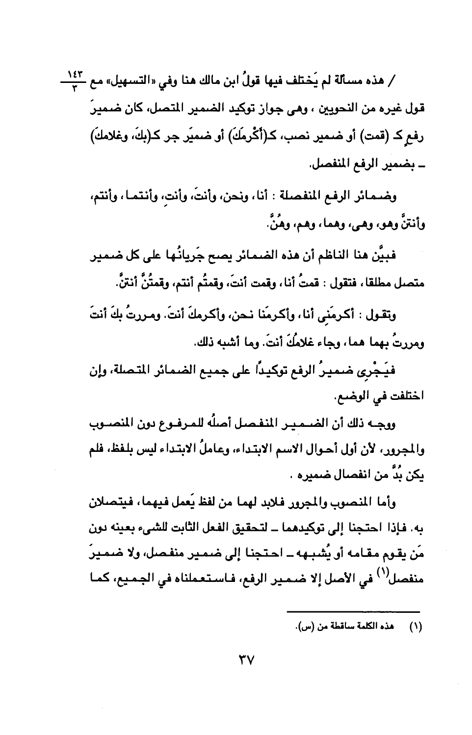 / هذه مسألة لم يختلف فيها قول ابن مالك هنا وفي "التسهيل" مع قول غيره من النحويين، وهي جواز توكيد الضمير المتصل، كان ضمير رفع كـ (قمت) أو ضمير نصب، كـ (أكرمك) أو ضمير جر كـ (بك، وغلامك) - بضمير الرفع المنفصل.