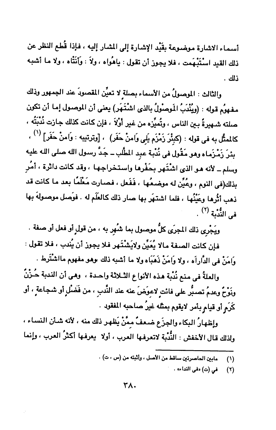والثالث: الموصول من الأسماء بصلةٍ لا تعين المقصود عند الجمهور وذلك مفهوم قوله: (ويندب الموصول بالذي اشتهر) يعني أن الموصول إما أن تكون صلته شهيرةً بين الناس، وتميزه من غير أولا، فإن كانت كذلك جازت ندبته، كالممثل به في قوله: (كبئر زمزم يلي وامن حفر)، [وترتيبه: وامن حفر]، بئر زمزماه وهو مقول في ندبة عبد المطلب- جد رسول الله صلى الله عليه وسلم- لأنه هو الذي اشتهر بحفرها واستخراجها، وقد كانت داثرة، أمر بذلك (في النوم، وعين له موضعها، ففعل، فصارت معلمًا بعبد ما كانت قد ذهب أثرها وعينها، فلما اشتهر بها صار ذلك كالعلم له. فوصل موصوله بها في الندبة.