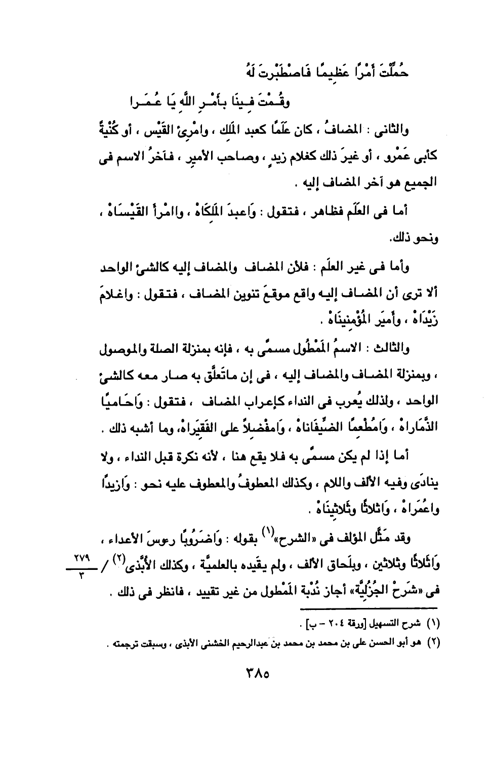 والثالث: الاسم الممطول مسمى به، فإنه بمنزلة الصلة والموصول، وبمنزلة المضاف والمضاف إليه، في إن ما تعلق به صار معه كالشيء الواحد، ولذلك يعرب في النداء كإعراب المضاف، فتقول: واحاميًا الذماراه، وامطعمًا الضيفاناه، وامفضلًا على الفقيراه، وما أشبه ذلك.