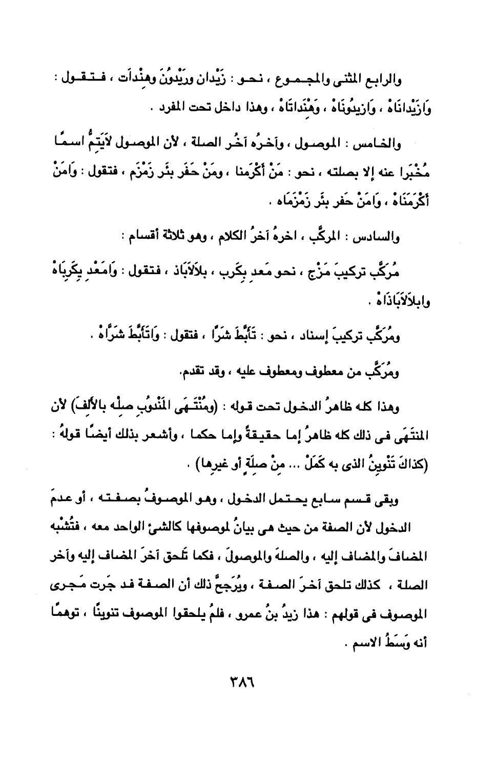 وبقى قسم سابع يحتمل الدخول، وهو الموصوف بصفته، أو عدم الدخول لأن الصفة من حيث هي بيان لموصوفها كالشيء الواحد معه، فتشبه المضاف إليه، والصلة والموصول، فكما تلحق آخر المضاف إليه وآخر الصلة، كذلك تلحق آخر الصفة، ويرجح ذلك أن الصفة قد جرت مجرى الموصوف في قولهم: هذا زيد بن عمرو، فلم يلحقوا الموصوف تنوينًا، توهمًا أنه وسط الاسم.