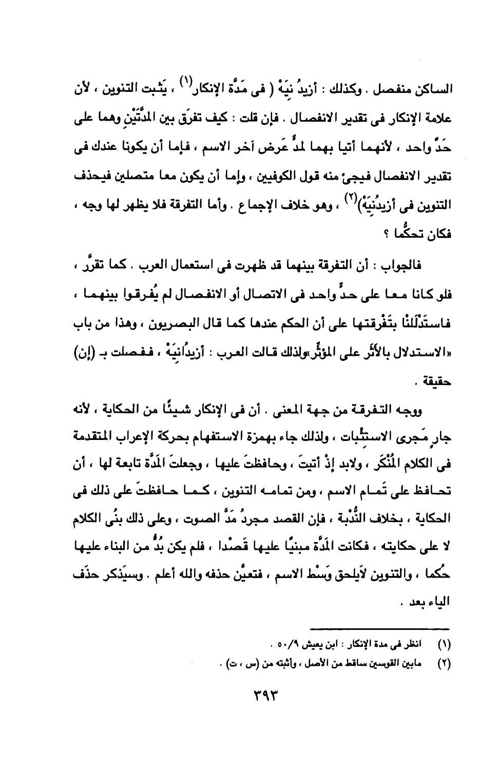 الساكن منفصل. وكذلك: أزيد نيه (في مدة الإنكار، يثبت التنوين، لأن علامة الإنكار في تقدير الانفصال. فإن قلت: كيف تفرق بين المدتين وهما على حد واحد، لأنهما أتيا بهما لمد عرض آخر الاسم، فإما أن يكونا عندك في تقدير الانفصال فيجيء منه قول الكوفيين، وإما أن يكون معا متصلين فيحذف التنوين في أزيدنيه)، وهو خلاف الإجماع. وأما التفرقة فلا يظهر لها وجه، فكان تحكما؟
