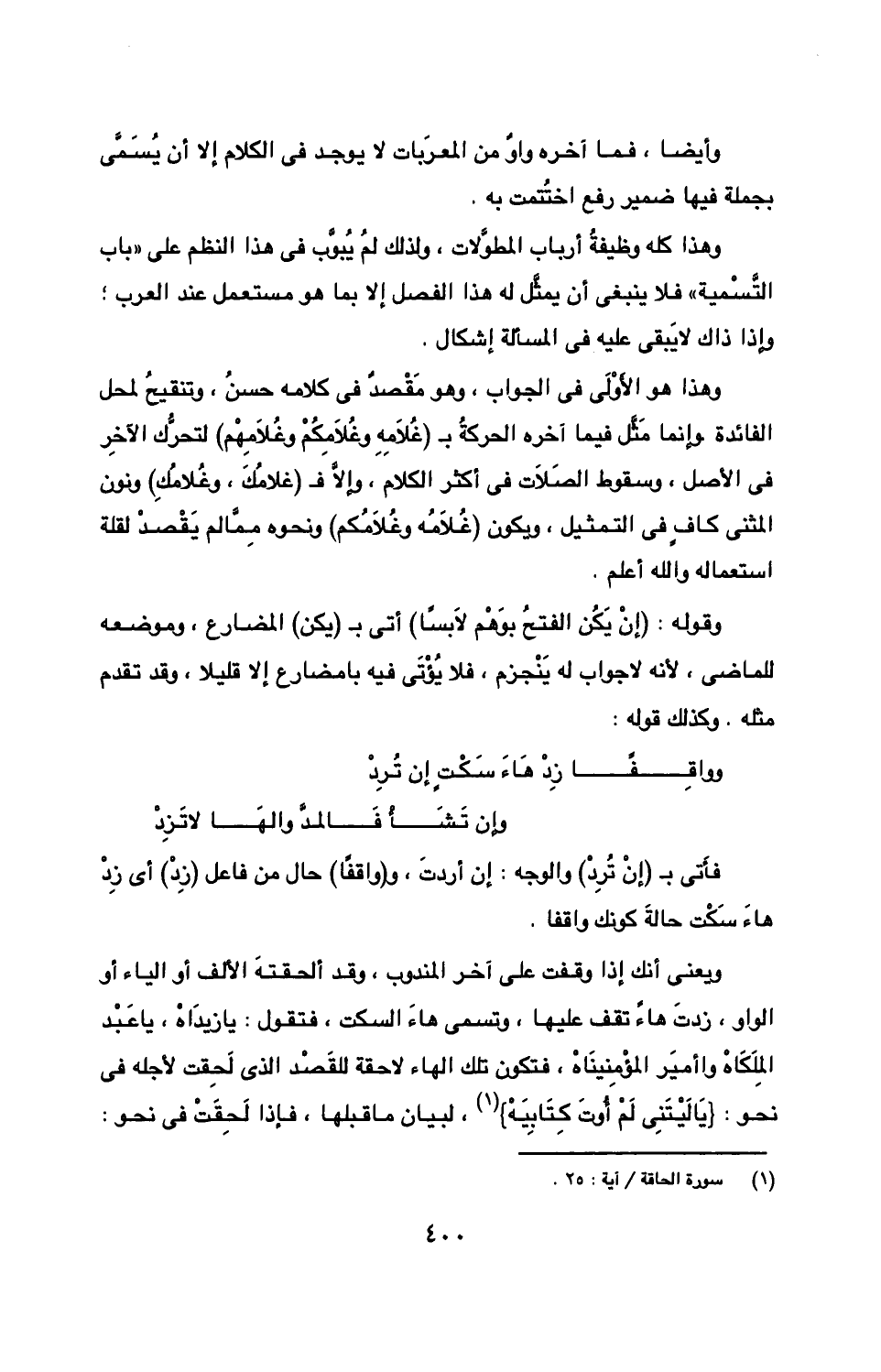 ويعني أنك إذا وقفت على آخر المندوب، وقد ألحقته الألف أو الياء أو الواو، زدت هاًء تقف عليها، وتسمى هاء السكت، فتقول: يا زيداه، يا عبد الملكاه واأمير المؤمنيناه، فتكون تلك الهاء لاحقة للقصد الذي لحقت لأجله في نحو: {يا ليتني لم أوت كتابيه}، لبيان ما قبلها، فإذا لحقت في نحو: