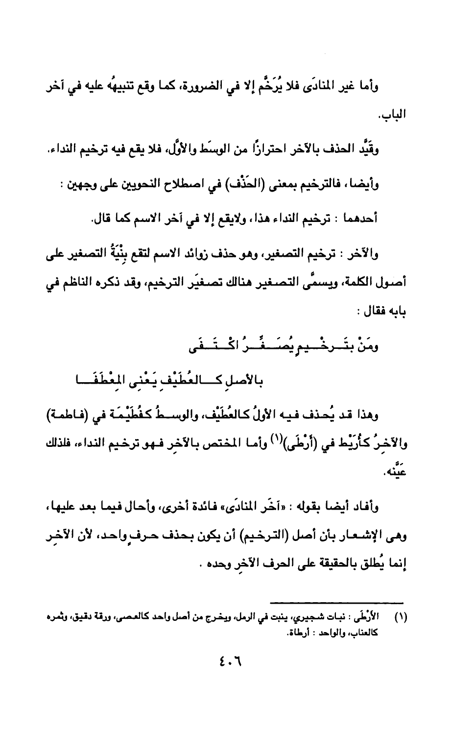 وهذا قد يحذف فيه الأول كالعطف، والوسط كفطيمة في (فاطمة) والآخر كأريط في (أرطى) وأما المختص بالآخر فهو ترخيم النداء، فلذلك عينه.