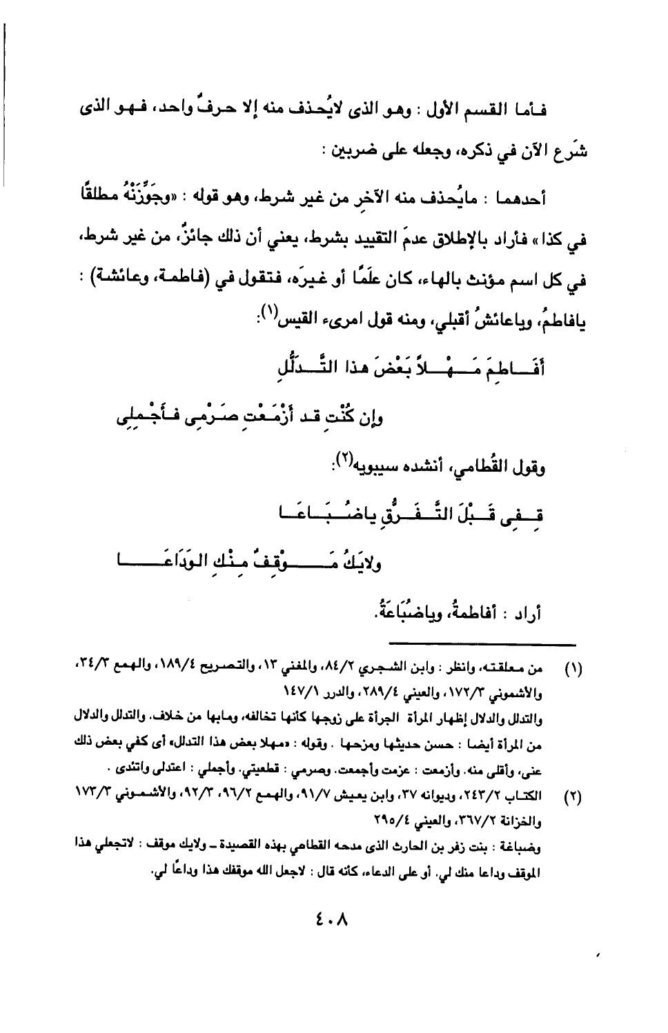 أحدهما: ما يحذف منه الآخر من غير شرط، وهو قوله: "وجوزنه مطلقًا في كذا" فأراد بالإطلاق عدم التقييد بشرط، يعني أن ذلك جائز، من غير شرط، في كل اسم مؤنث بالهاء، كان علمًا أو غيره، فتقول في (فاطمة، وعائشة): يا فاطم، ويا عائش أقبلي، ومنه قول امرئ القيس: