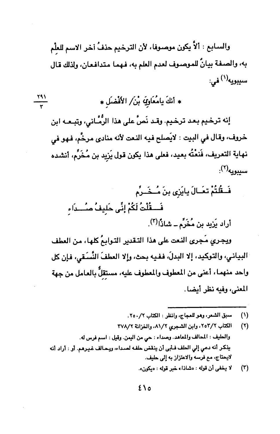 إنه ترخيم بعد ترخيم. وقد نص على هذا الرماني، وتبعه ابن خروف، وقال في البيت: لا يصلح فيه النعت لأنه منادى مرخم، فهو في نهاية التعريف، فنعته بعيد، فعلى هذا يكون قول يزيد بن مخرم، أنشده سيبويه: