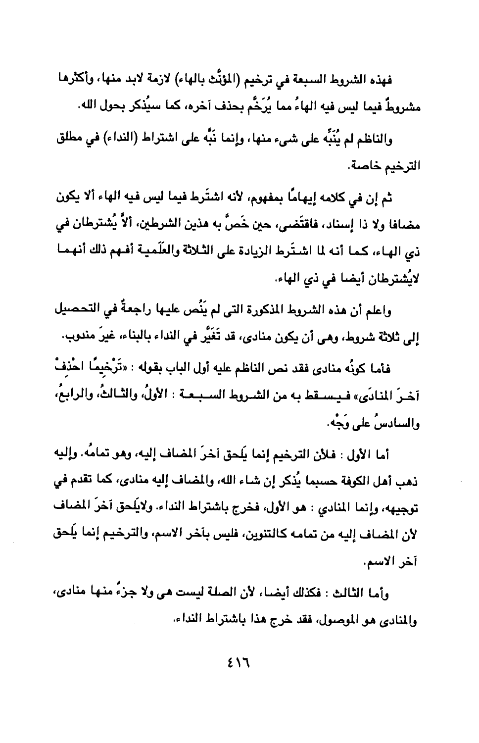 فهذه الشروط السبعة في ترخيم (المؤنث بالهاء) لازمة لابد منها، وأكثرها مشروط فيما ليس فيه الهاء مما يرخم بحذف آخره، كما سيذكر بحول الله.