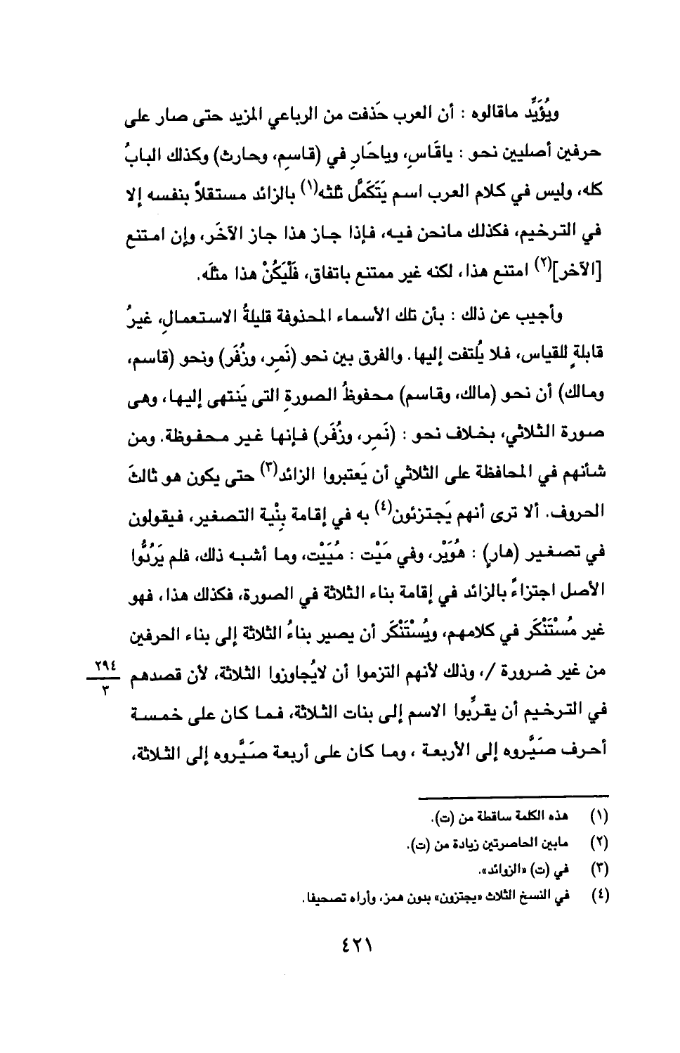 ويؤيد ما قالوه: أن العرب حذفت من الرباعي المزيد حتى صار على حرفين أصليين نحو: يا قاس، ويا حار في (قاسم، وحارث) وكذلك الباب كله، وليس في كلام العرب اسم يتكمل ثلثه بالزائد مستقلًا بنفسه إلا في الترخيم، فكذلك ما نحن فيه، فإذا جاز هذا جاز الآخر، وإن امتنع [الآخر] امتنع هذا، لكنه غير ممتنع باتفاق، فليكن هذا مثله.