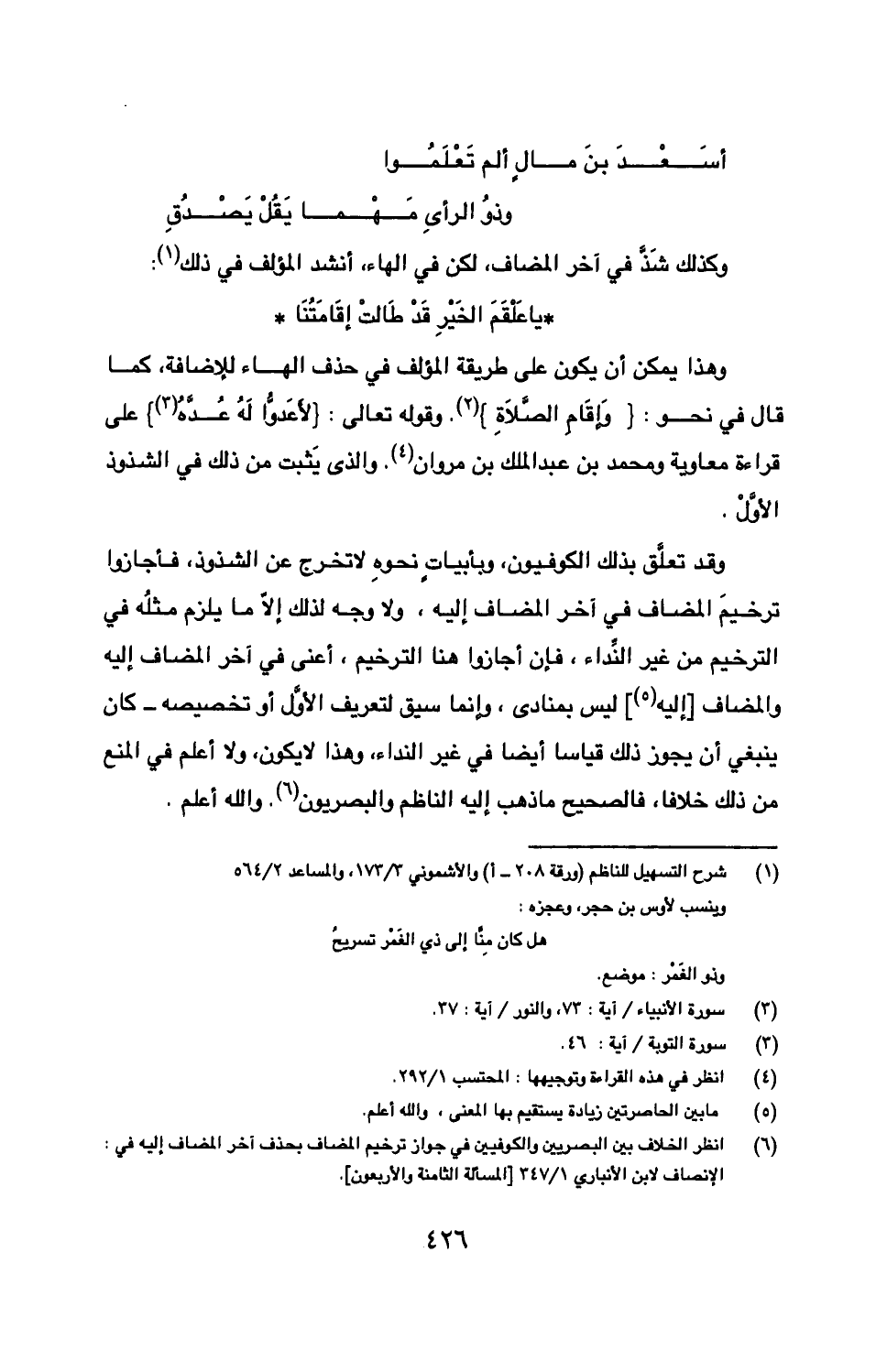 وهذا يمكن أن يكون على طريقة المؤلف في حذف الهاء للإضافة، كما قال في نحو: {وإقامِ الصلاة}. وقوله تعالى: {لأعدوا له عدهُ} على قراءة معاوية ومحمد بن عبد الملك بن مروان. والذي يثبت من ذلك في الشذوذ الأول.
