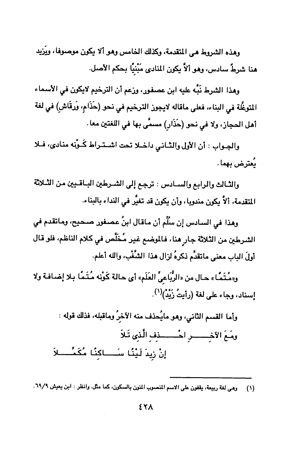 وهذه الشروط هي المتقدمة، وكذلك الخامس وهو ألا يكون موصوفا، ويزيد هنا شرط سادس، وهو ألا يكون المنادى مبنيًا بحكم الأصل.