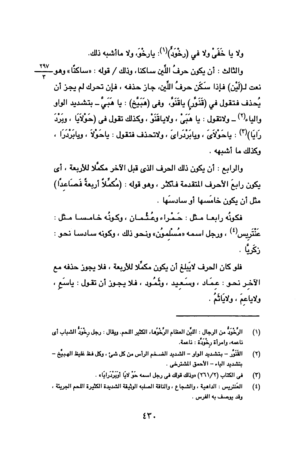 فلو كان الحرف لا يبلغ أن يكون مكملا للأربعة، فلا يجوز حذفه مع الآخر نحو: عماد، وسعيد، وثمود، فلا يجوز أن تقول: يا سع، ولا يا عم، ولا يا ثم.