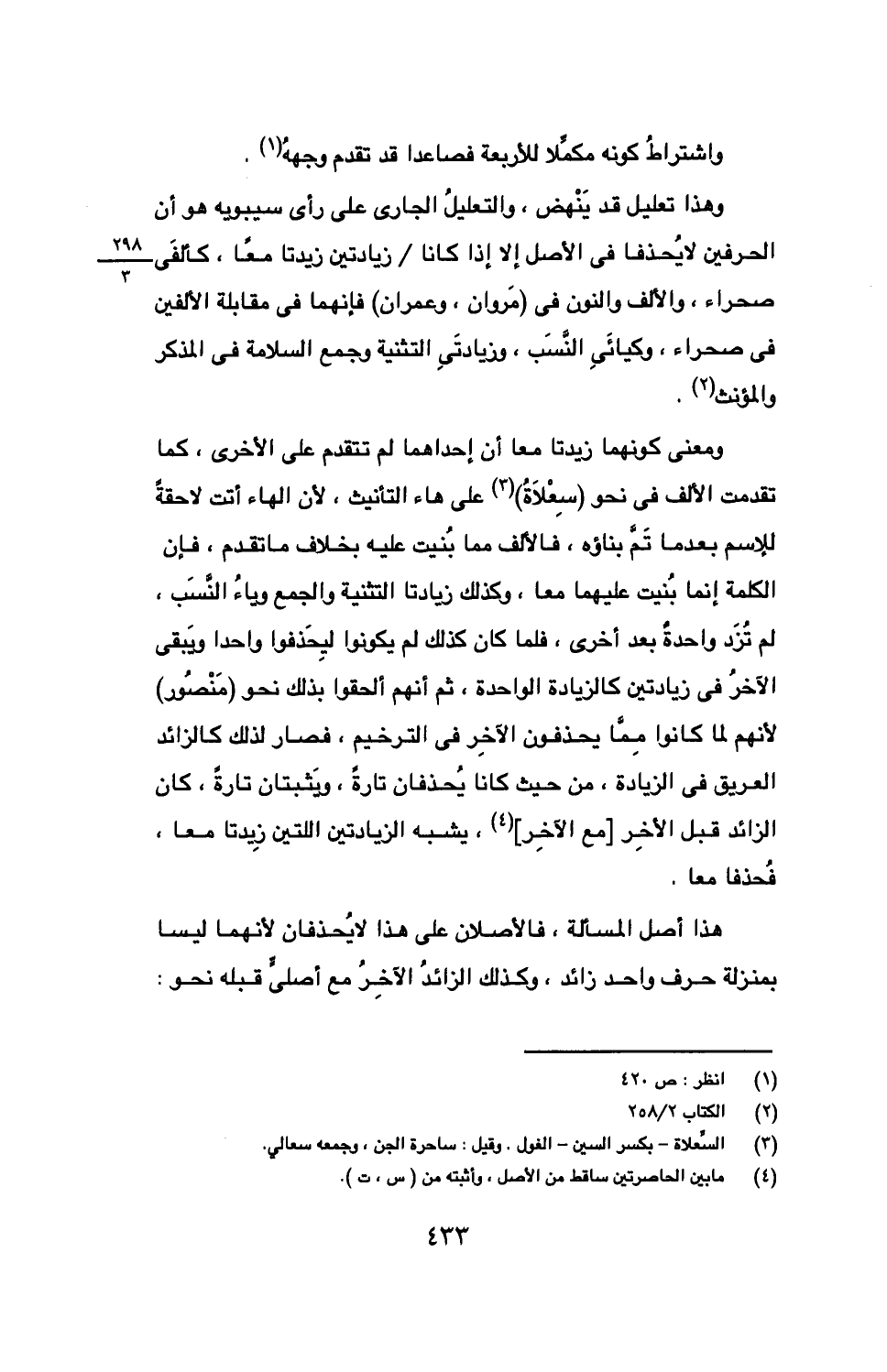 وهذا تعليل قد ينهض، والتعليل الجاري على رأي سيبويه هو أن الحرفين لا يحذفا في الأصل إلا إذا كانا زيدتا معًا، كألفي صحراء، والألف والنون في (مروان، وعمران) فإنهما في مقابلة الألفين في صحراء، وكيائي النسب، وزيادتي التثنية وجمع السلامة في المذكر والمؤنث.