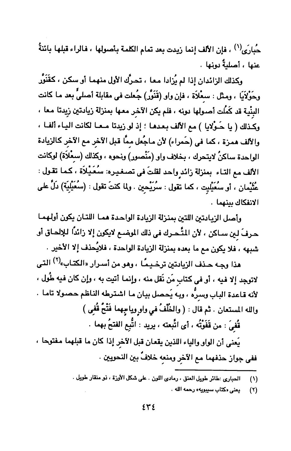 وكذلك الزائدان إذا لم يزادا معا، تحرك الأول منهما أو سكن، كقنور وحولايا، ومثل: سعلاة، فإن واو (قنور) جعلت في مقابلة أصلي بعد ما كانت البنية قد كملت أصولها دونه، فلم يكن الآخر معها بمنزلة زيادتين زيدتا معا، وكذلك (يا حولايا) مع الألف بعدها؛ إذ لو زيدتا معا لكانت الياء ألفا، والألف همزة، كما في (حمراء) لأن ما جعل مما قبل الآخر مع الآخر كالزيادة الواحدة ساكن لا يتحرك، بخلاف واو (منصور) ونحوه، وكذلك (سعلاة) لو كانت الألف مع التاء بمنزلة زائدٍ واحد لقلت في تصغيره: سعيلاة، كما تقول: عثيمان، أو سعيليت، كما تقول: سريحين. ولما كنت تقول: (سعيلية) دل على الانفكاك بينهما.