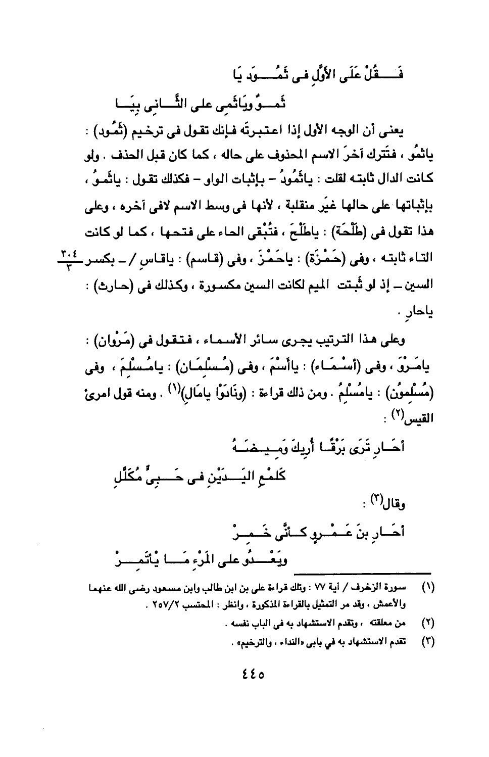 وعلى هذا الترتيب يجري سائر الأسماء, فتقول في (مروان): يا مرو, وفي (أسماء): يا أسم, وفي (مسلمان): يا مسلم, وفي (مسلمون): يا مسلم. ومن ذلك قراءة: (ونادوا يا مال). ومنه قول امرئ القيس: