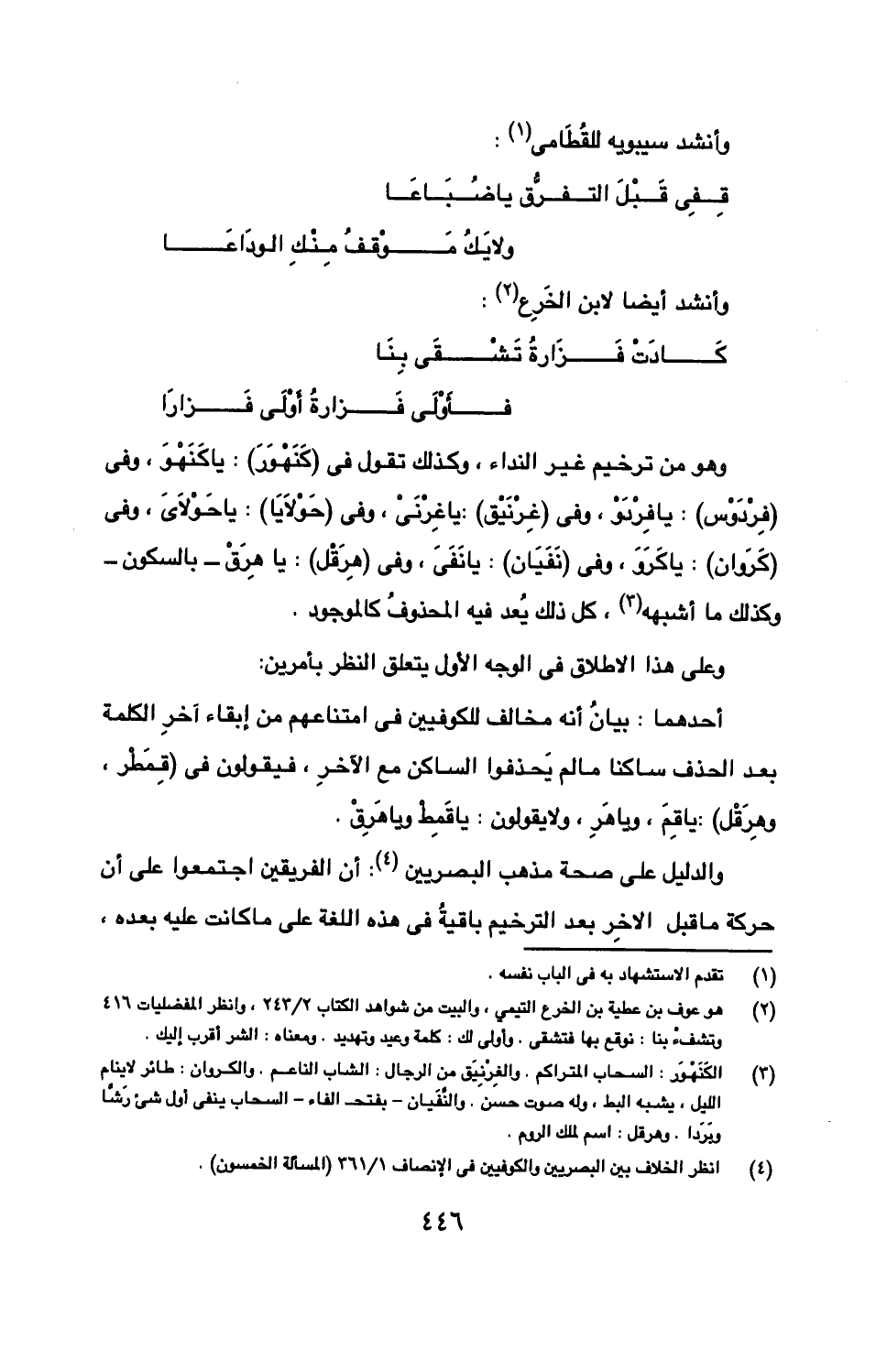 وهو من ترخيم غير النداء, وكذلك تقول في (كنهور): يا كنهو, وفي (فردوس): يا فردو, وفي (غرنيق): يا غرني, وفي (حولايا): يا حولاى, وفي (كروان): يا كرو, وفي (نفيان): يا نفي, وفي (هرقل): يا هرق- بالسكون- وكذلك ما أشبه, كل ذلك يعد فيه المحذوف كالموجود.