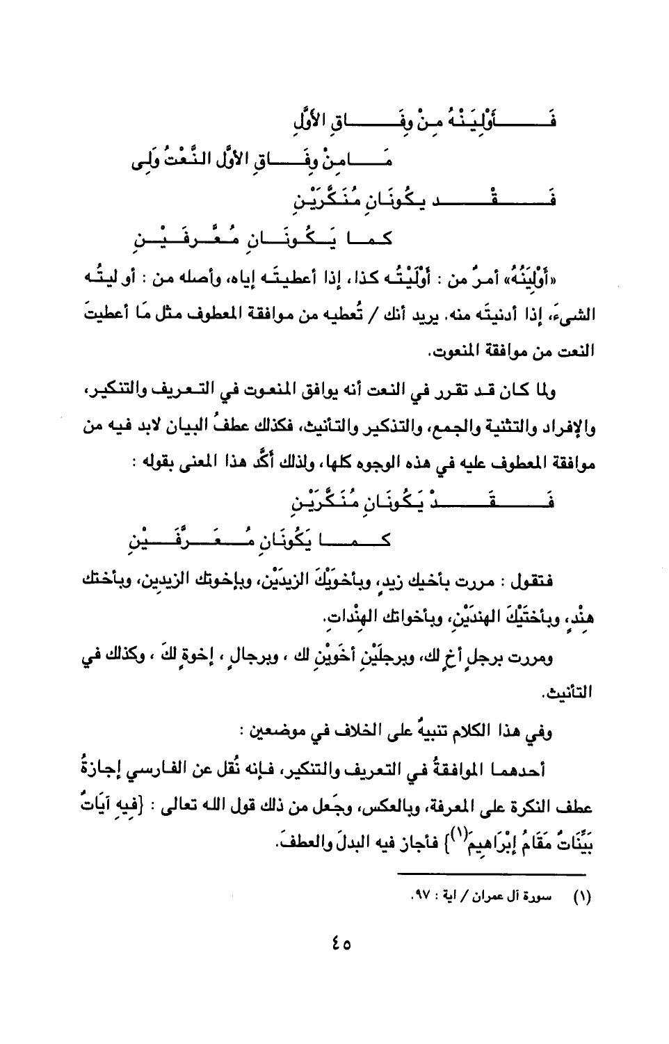 أحدهما الموافقةُ في التعريف والتنكير، فإنه نُقل عن الفارسي إجازةُ عطف النكرة على المعرفة، وبالعكس، وجَعل من ذلك قول الله تعالى: {فِيهِ آيَاتٌ بَيَّنَاتٌ مَقَامُ إبْرَاهِيمَ} فأجاز فيه البدلَ والعطفَ.