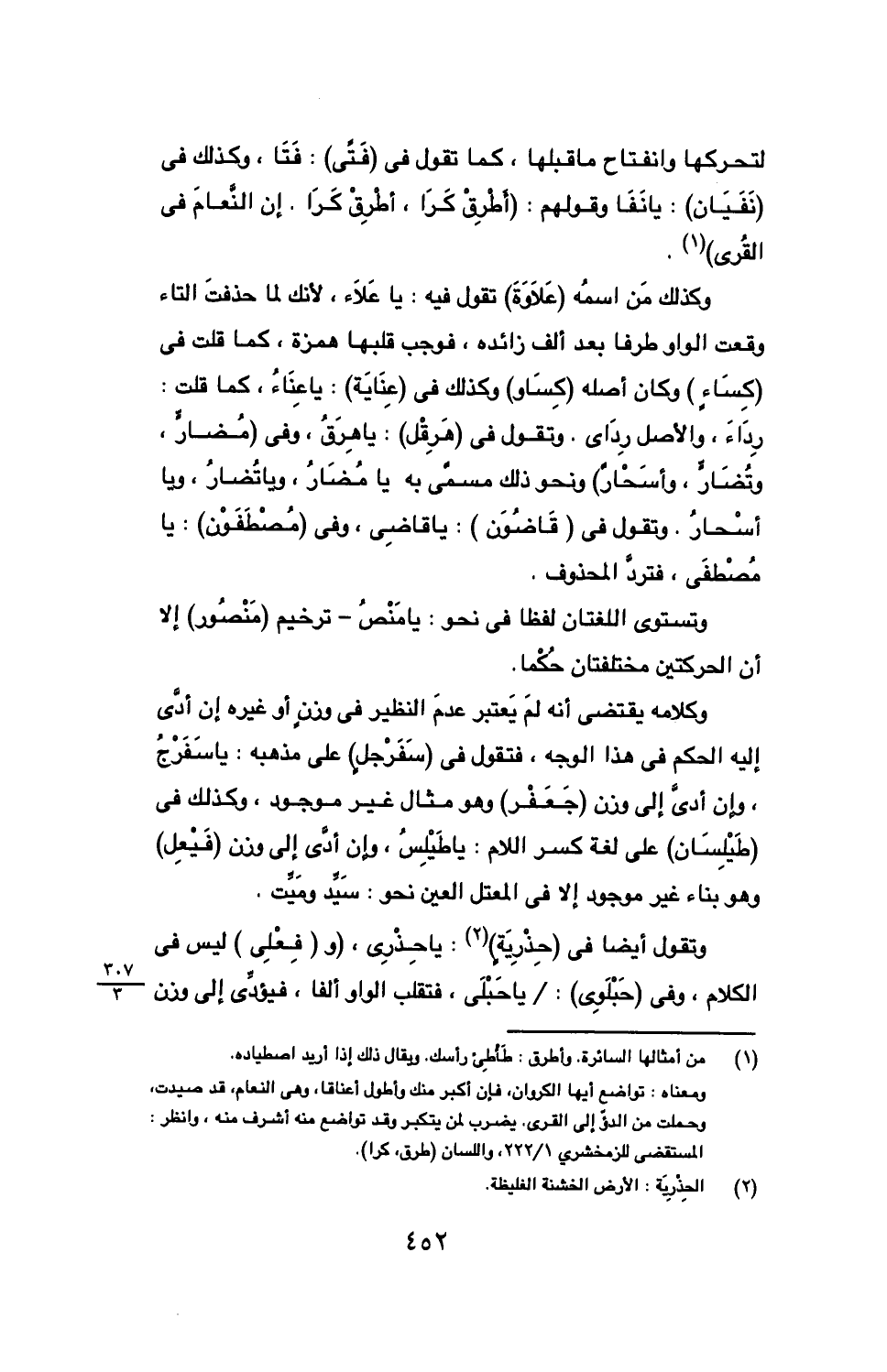 وكذلك من اسمه (علاوة) تقول فيه: يا علاء, لأنك لما حذفت التاء وقعت الواو طرفا بعد ألف زائده, فوجب قلبها همزة, كما قلت في (كساء) وكان أصله (كساو) وكذلك في عناية): يا عناء, كما قلت: رداء, والأصل رداى. وتقول في (هرقل): يا هرق, وفي (مضار, وتضار, وأسحار) ونحو ذلك مسمى به يا مضار, ويا تضار, ويا أسحار. وتقول في (قاضون): يا قاضي, وفي (مصطفون): يا مصطفى, فترد المحذوف.