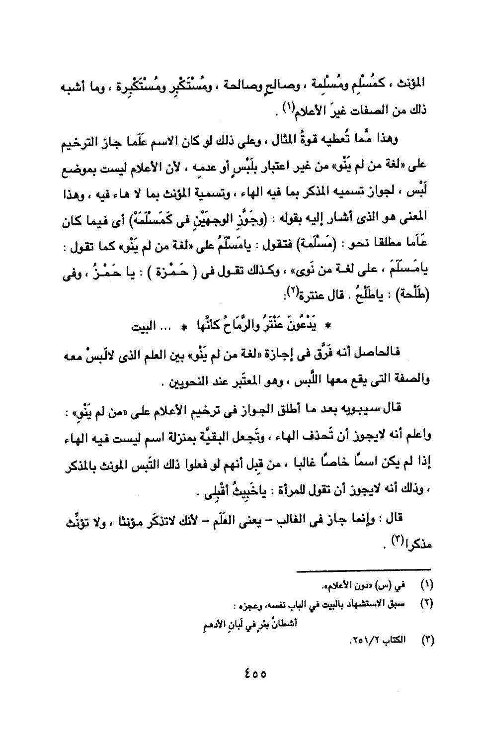 وهذا مما تعطيه قوة المثال, وعلى ذلك لو كان الاسم علما جاز الترخيم على "لغة من لم ينو" من غير اعتبار بلبس أو عدمه, لأن الأعلام ليست بموضع لبس, لجواز تسميه المذكر بما فيه الهاء, وتسمية المؤنث بما لا هاء فيه, وهذا المعنى هو الذي أشار إليه بقوله: (وجوز الوجهين في كمسلمه) أى فيما كان عاما مطلقا نحو: (مسلمة) فتقول: يا مسلم على "لغة من لم ينو" كما تقول: يا مسلم, على لغة من نوى", وكذلك تقول في (حمزة): يا حمز, وفي (طلحة): يا طلح. قال عنترة: