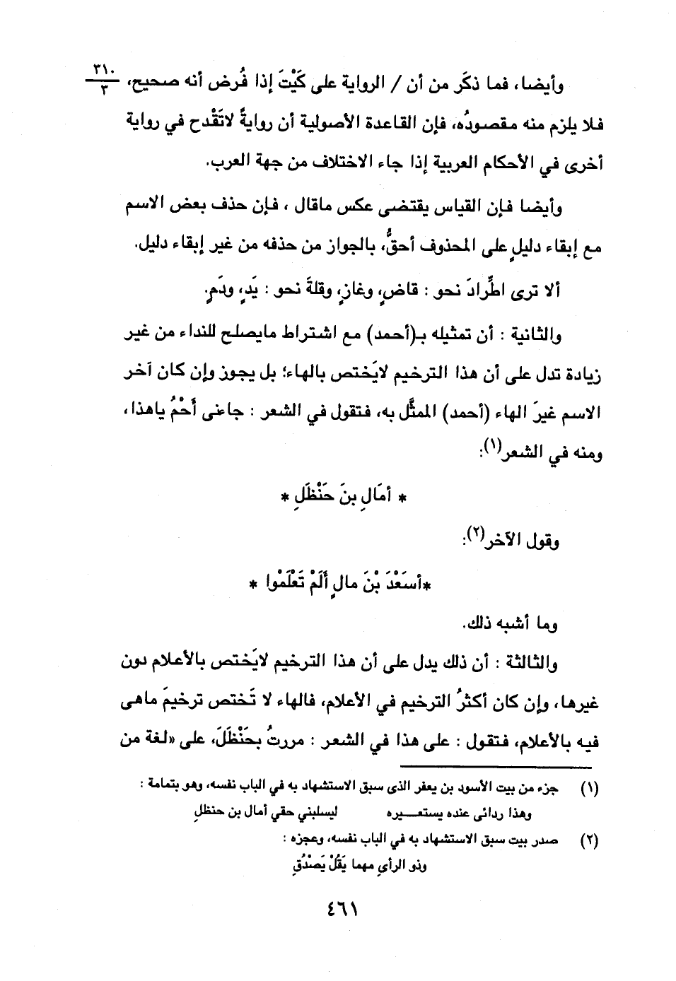 والثانية: أن تمثيلية ب (أحمد) مع اشتراط ما يصلح للنداء من غير زيادة يدل على أن هذا الترخيم لا يختص بالهاء؛ بل يجوز وإن كان آخر الاسم غير الهاء (أحمد) الممثل به, فتقول في الشعر: جاءني أحم يا هذا, ومنه في الشعر: