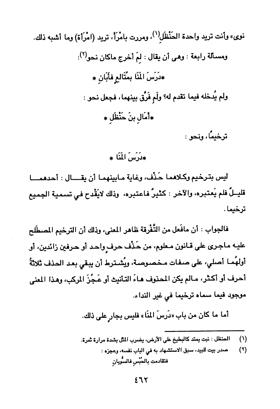 فالجواب: أن ما فعل من التفرقة ظاهر المعنى, وذلك أن الترخيم المصطلح عليه ما جرى على قانون معلوم, من حذف حرف واحد أو حرفين زائدين, أو أولهما أصلي, على صفات مخصوصة, ويشترط أن يبقي بعد الحذف ثلاثة أحرف أو أكثر, ما لم يكن المحذوف هاء التأنيث أو عجز المركب, وهذا المعنى موجود فيما سماه ترخيما في غير النداء.