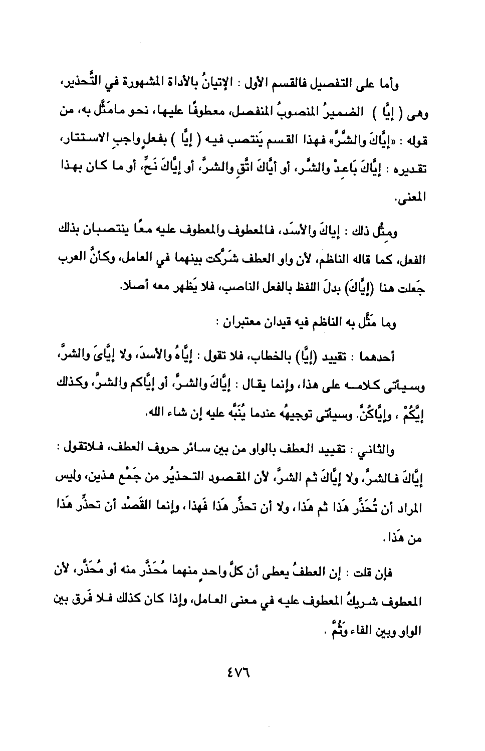 والثاني: تقييد العطف بالواو من بين سائر حروف العطف, فلا تقول: إياك فالشر, ولا إياك ثم الشر, لأن المقصود التحذير من جمع هذين, وليس المراد أن تحذر هذا ثم هذا, ولا أن تحذر هذا فهذا, وإنما القصد أن تحذر هذا من هذا.
