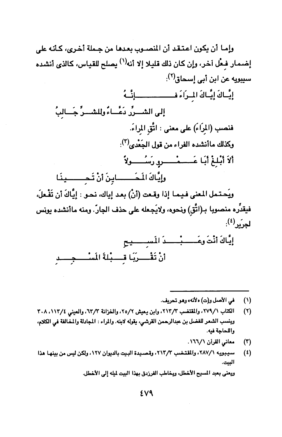 ويحتمل المعنى فيما إذا وقعت (أن) بعد إياك, نحو: إياك أن تفعل, فيقدره منصوبا بـ (اتق) ونحوه, ولا يجعله على حذف الجار. ومنه ما أنشده يونس لجرير: