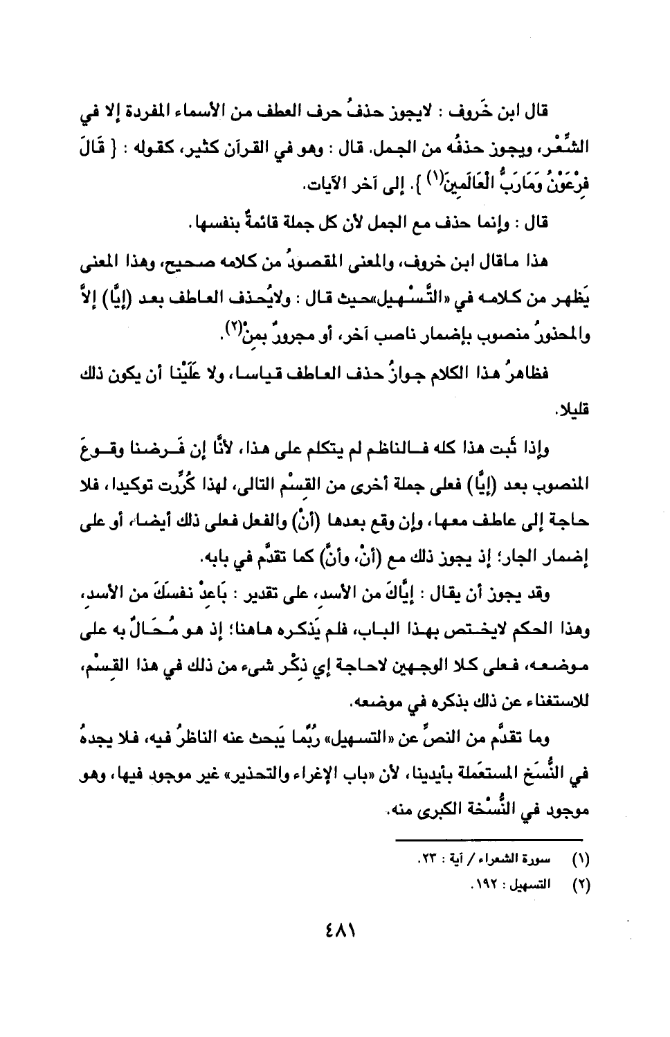 وما تقدم من النص عن "التسهيل" ربما يبحث عنه الناظر فيه, فلا يجده في النسخ المستعملة بأيدينا, لأن "باب الإغراء والتحذير" غير موجود فيها, وهو موجود في النسخة الكبرى منه.