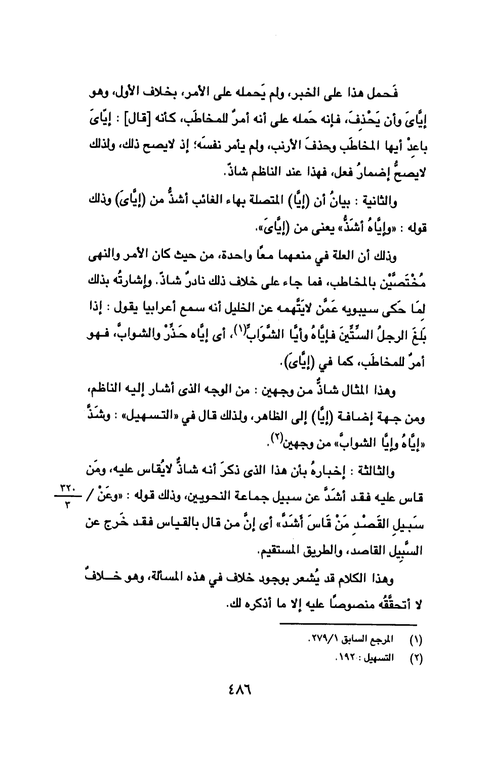 والثانية: بيان أن (إيا) المتصلة بهاء الغائب أشذ من (إياي) وذلك قوله: "وإياه أشذ" يعني من (إياي) ".