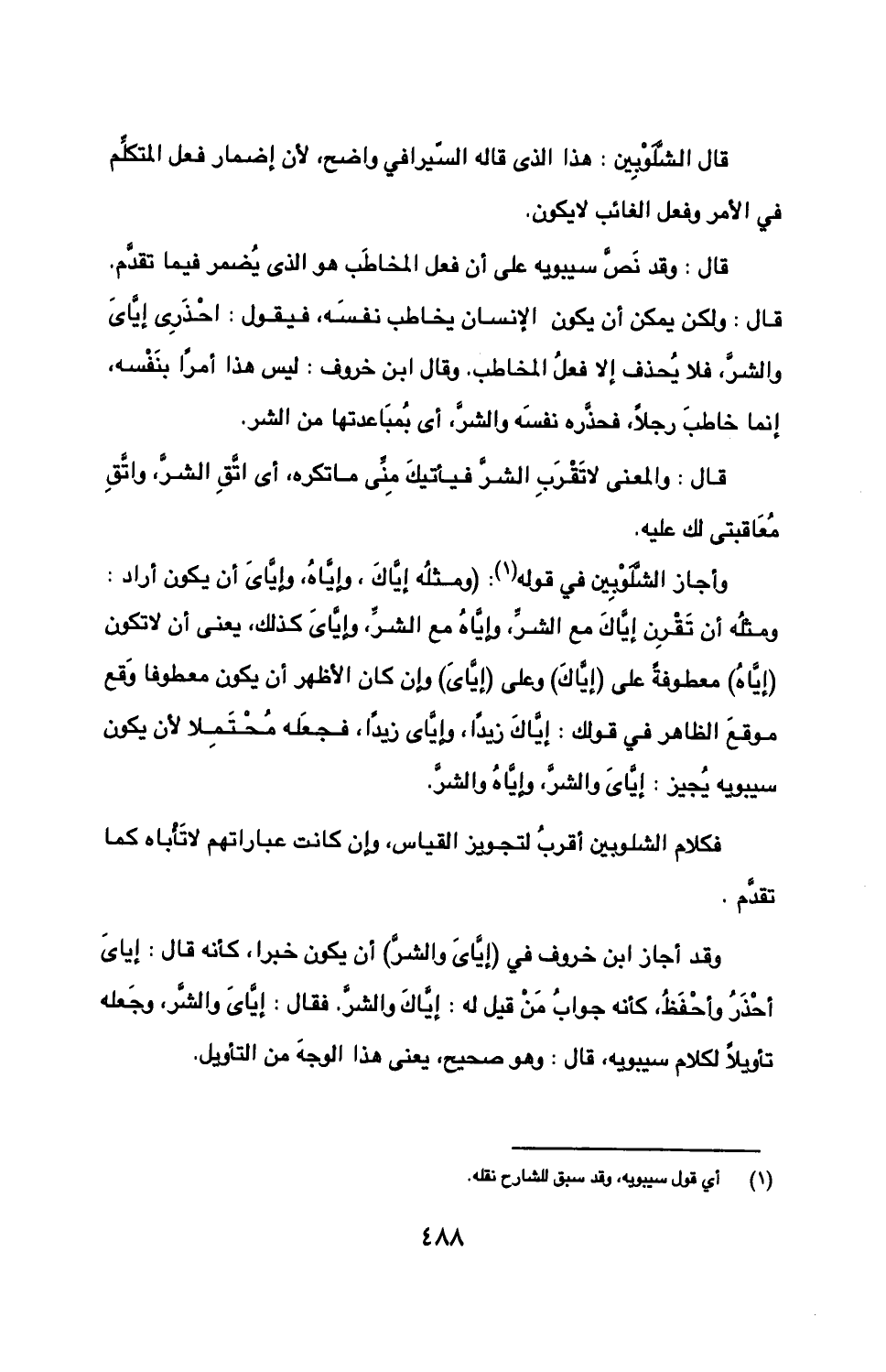 وأجاز الشلوبين في قوله: (ومثله إياك, وإياه, وإياي أن يكون أراد: ومثله أن تقرن إياك مع الشر, وإياه مع الشر, وإياي كذلك, يعني أن لا تكون (إياه) معطوفة على (إياك) وعلى (إياي) وإن كان الأظهر أن يكون معطوفا وقع موقع الظاهر في قولك: إياك زيدًا, وإياي زيدًا, فجعله محتملا لأن يكون سيبويه يجيز: إياي والشر, وإياه والشر.