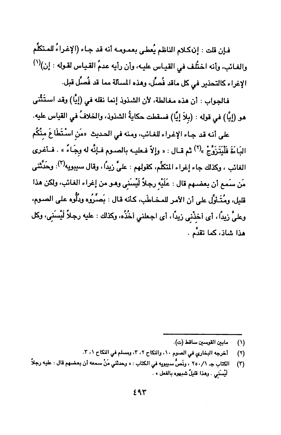 على أنه قد جاء الإغراء للغائب، ومنه في الحديث "من استطاع منكم الباءة فليتزوج" ثم قال: "وإلا فعليه بالصوم فإنه له وجاء". فأغرى الغائب، وكذلك جاء إغراء المتكلم، كقولهم: على زيدًا، وقال سيبويه: وحدثني من سمع أن بعضهم قال: عليه رجلًا ليسني وهو من إغراء الغائب، ولكن هذا قليل، ومتأول على أن الأمر للمخاطب، كأنه قال: بصروه ودلوه على الصوم، وعلى زيدًا، أي أخذني زيدًا، أي اجعلني أخذه، وكذلك: عليه رجلًا ليسني، وكل هذا شاذ، كما تقدم.