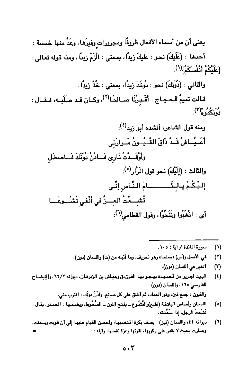 أحدها: (عليك) نحو: عليك زيدًا، بمعنى: الزم زيدًا، ومنه قوله تعالى: {عليكم أنفسكم}.
