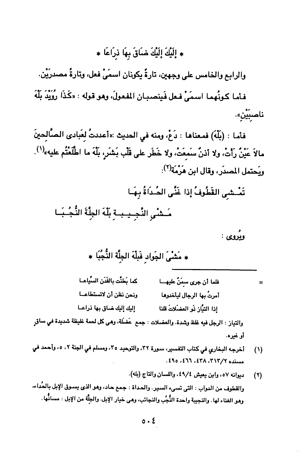 فأما: (بله) فمعناها: دع، ومنه في الحديث: "أعددت لعبادي الصالحين مالا عين رأت، ولا أذن سمعت، ولا خطر على قلب بشرٍ، بله ما اطلعتم عليه. ويحتمل المصدر، وقال ابن هرمة: